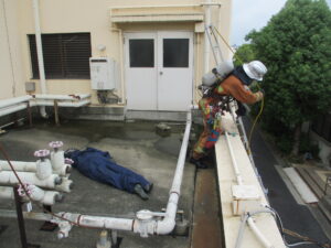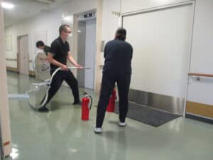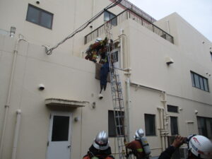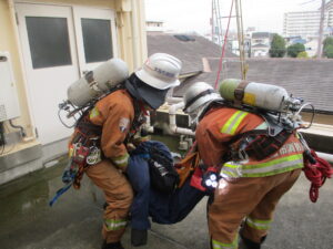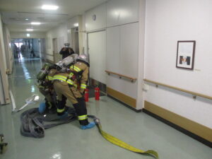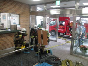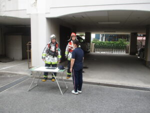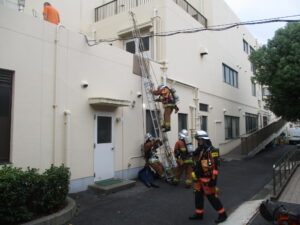 訓練は通報・消火・避難を一連の流れで行い、2Fに要救助者が1名取り残されている事を想定とし消防隊員による救助活動の見学をさせていただきました。消防隊の動きや連携、声かけ、安全確認など学ぶ事が多くとても有意義な時間となりました。